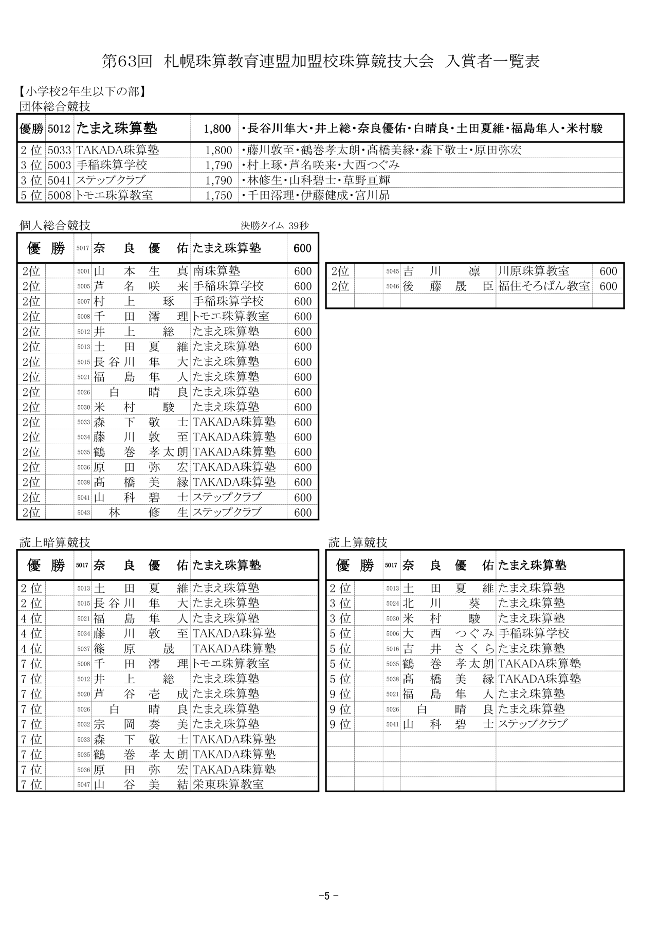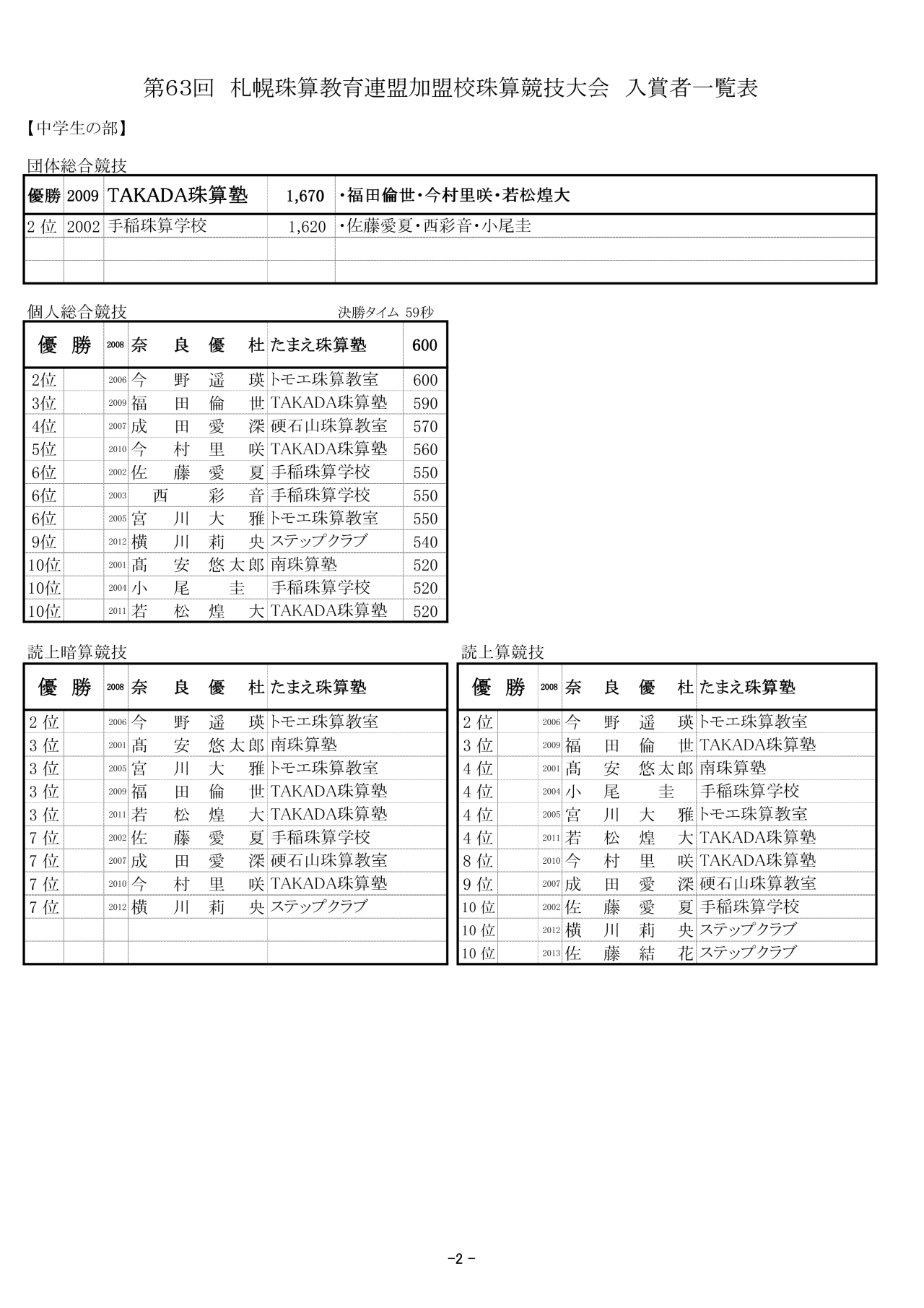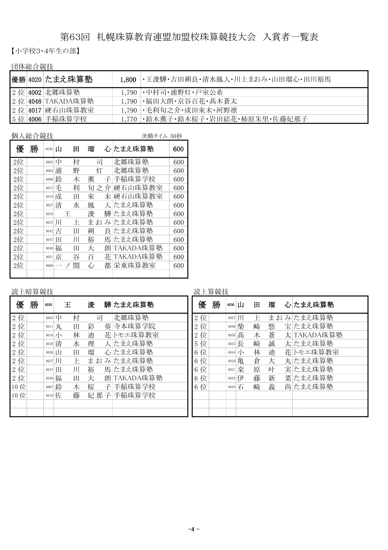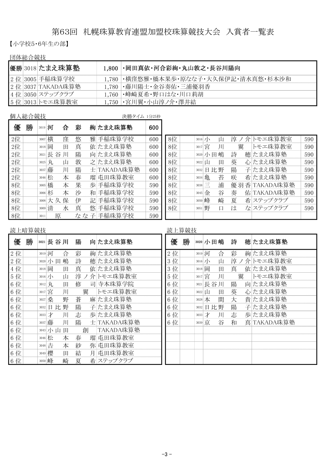 第63回 札幌珠算教育連盟加盟校珠算競技大会 入賞者一覧