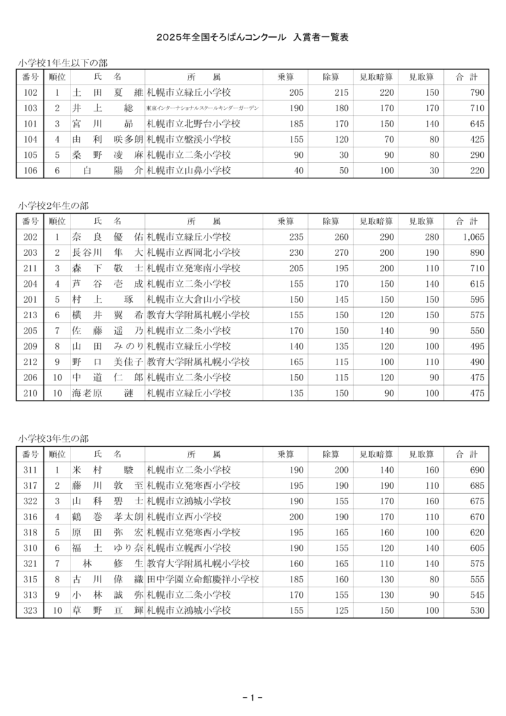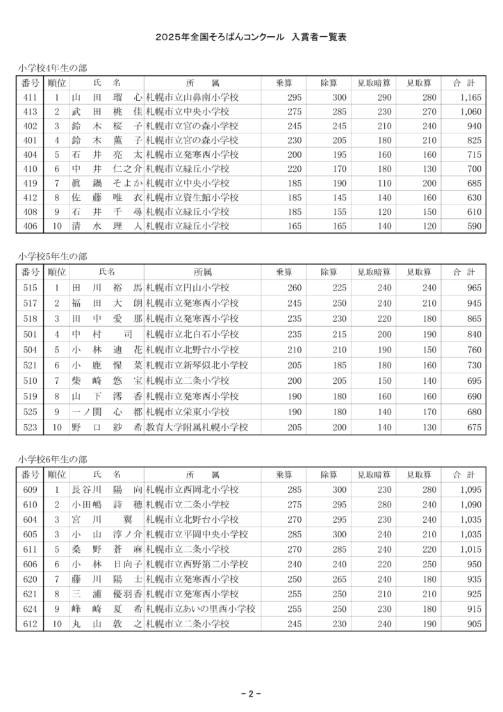 2025年全国そろばんコンクール成績発表 2025年12月7日 2025年全国そろばんコンクールが実施されました。 日程:令和7年12月1日(月)~6日(土)参加者:138名 学年別入賞者一覧(1位~10位迄)